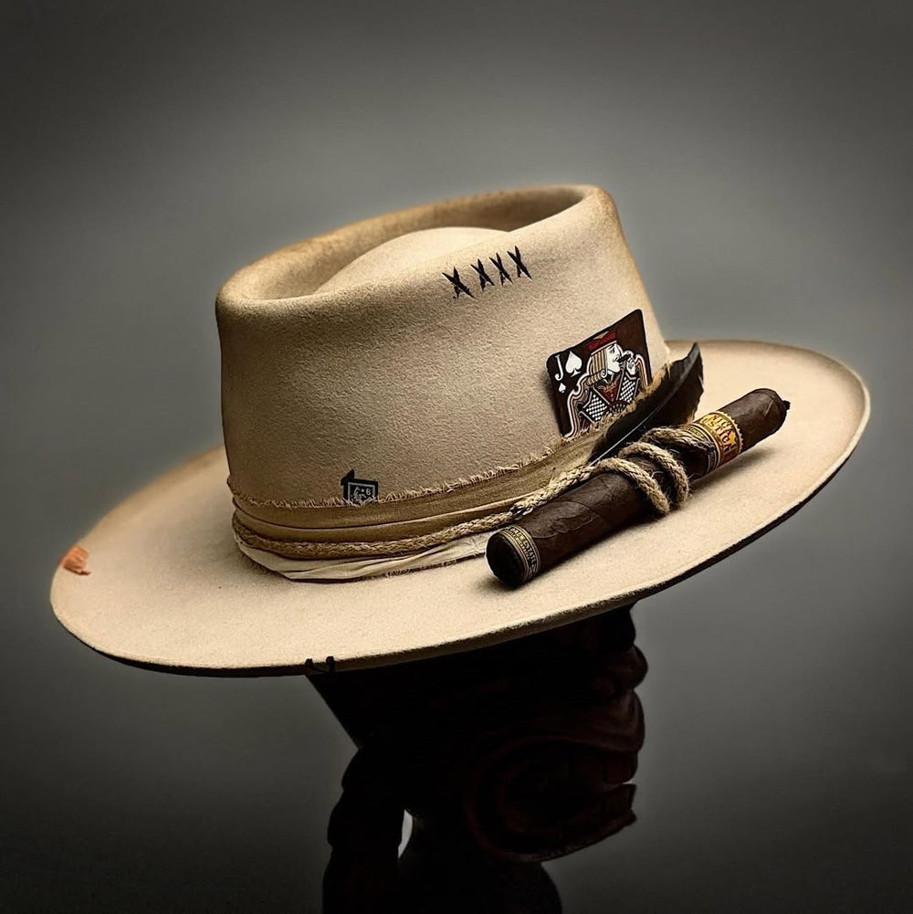 This is a Western - style hat with a unique design. The main body is light beige, and the material seems to be felt, with a classic hat shape. The hat body has personalized decorations, such as a poker card pattern patch, symbol - like scratches, as well as hemp ropes, a cigar - shaped object, and feather matching, adding a sense of retro and unruliness. It has rich details, integrating the roughness of Western cowboys and creative ingenuity, showing a different trendy style.